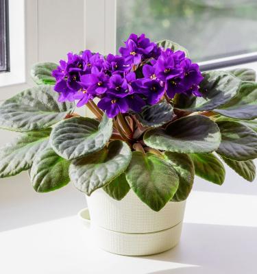 African Violet (Saintpaulia ionantha) produces fuzzy leaves and year-round flowers in moderate light, safe even if sampled.